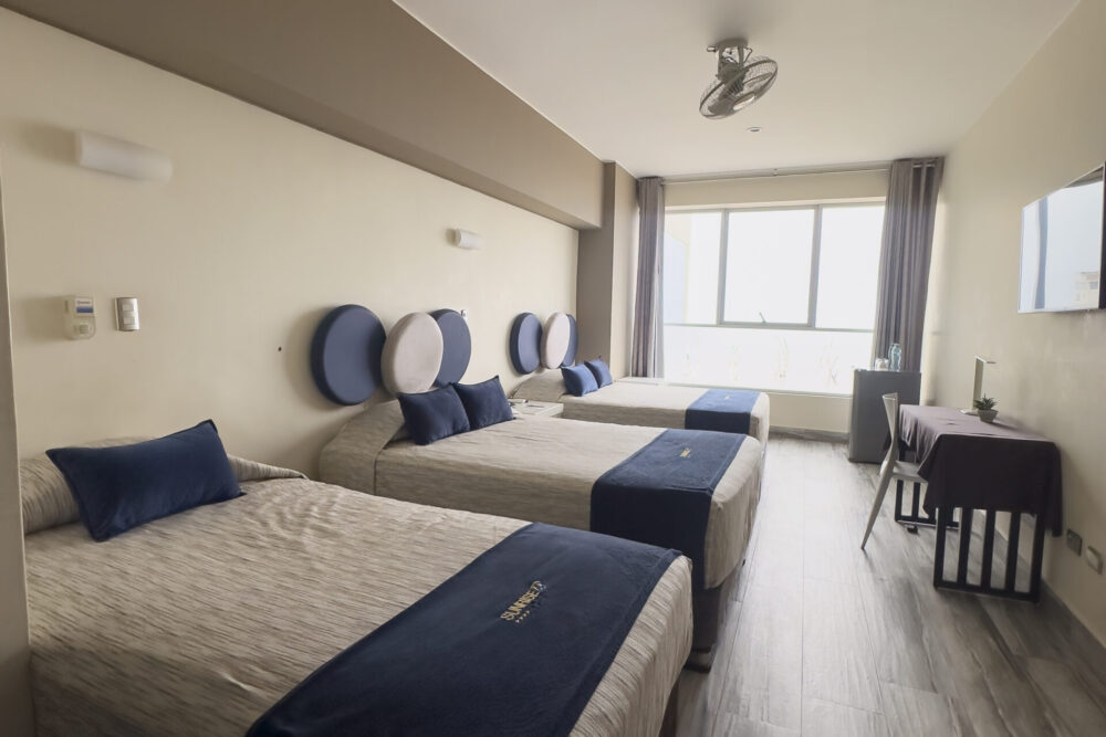 “Amplitud y confort sin compromisos. Nuestra Habitación Triple es la máxima expresión de versatilidad, ofreciendo un refugio espacioso para grupos o familias que buscan la experiencia Sunrise. Diseño inteligente y atmósfera acogedora para que cada huésped disfrute de su propio espacio de relax.”